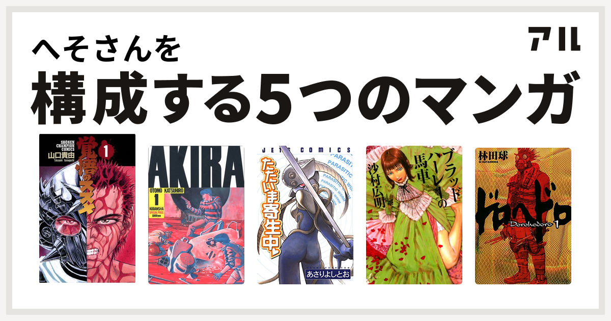 へそさんを構成するマンガは覚悟のススメ Akira ただいま寄生中 ブラッドハーレーの馬車 ドロヘドロ 私を構成する5つのマンガ アル